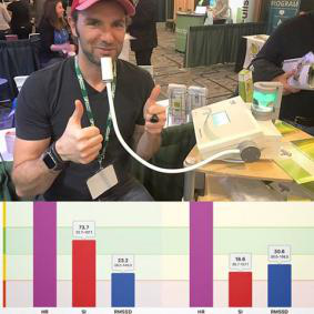 虽然我没有“六块腹肌”,但我的身体相当的精瘦/健壮,而且在过去的几年里,我的身体成份保持的相当稳定。我没有改变任何饮食和锻炼习惯,但当我使用NanoVi后,Nokia身体有氧运动表显示:虽然我的体重保持稳定,但我们肌肉量增加了,且脂肪含量迅速下降超过3%。照片下方的图表是Bob和他今年早些时候在综合医疗保健研讨会上做的HRV测量结果。